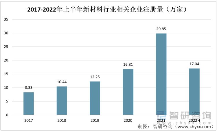 近几年,中国新材料相关企业注册量总体呈现快速增长的趋势。2017年-2021年我国新材料相关企业注册量由8.33万家增至29.85万家,年均复合增长率37.6%。最新数据显示,截至2022年上半年,我国新增新材料企业17.04万家。
