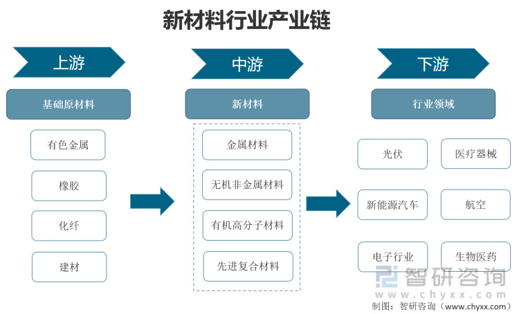 新材料行业上游为一些基础原材料,包含有色金属、橡胶、化纤、建材等。新材料行业中游为新材料按组分为金属材料、无机非金属材料、有机高分子材料、先进复合材料四大类。按材料性能分为结构材料和功能材料。新材料行业下游包含了光伏,新能源汽车、电子行业、医疗器械、航空和生物医药等多个领域。